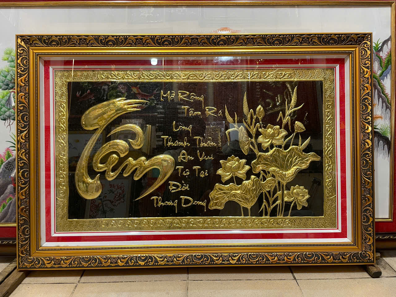 -Chất liệu tranh chữ tâm thư pháp ,được gò rất tinh xảo bằng đồng vàng liền tấm nguyên chất ,khung tranh hoa văn vàng hoặc màu vân gỗ ,kính nổi nhật.