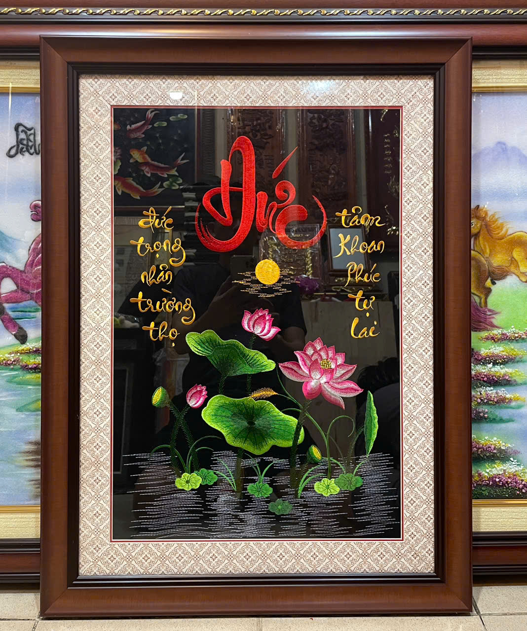 Chất liệu tranh thêu , tranh đã bao gồm lồng khung ,kính như hình ảnh mẫu.